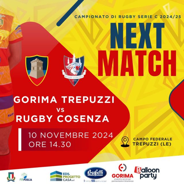 Il GORIMA Trepuzzi non si scompone, rientra in campo alzando il ritmo di gioco e nel giro di poche lancette di orologio realizza due mete, al 3’ con Spedicato e al 9’ con Olibardi, Nestola trasforma la seconda e porta in vantaggio i salentini sul 12-10. Il Cosenza ha poche energie per provare a reagire, i giallorossi continuano ad attaccare e grazie a due calci piazzati, entrambi trasformati da Nestola, si portano sul 18-10. Nel finale il Cosenza ha una reazione di orgoglio e accorcia le distanze con un calcio di punizione. Per il GORIMA Trepuzzi si tratta di un ulteriore passo in avanti nel processo di crescita e maturazione, e di una importante iniezione di fiducia per una squadra con l’età media più bassa del campionato.